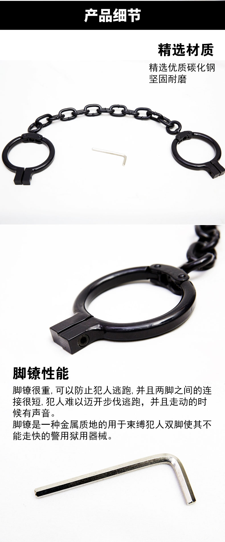 脚镣很重,可以防止犯人逃跑,并且两脚之间的连接很短,犯人难以迈开步伐逃跑,并且走动的时候有声音。脚镣是一种金属质地的用于束缚犯人双脚使其不能走快的警用狱用器械