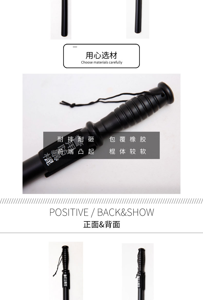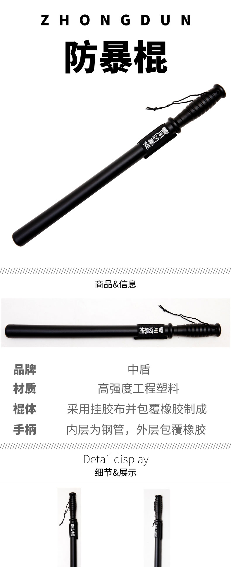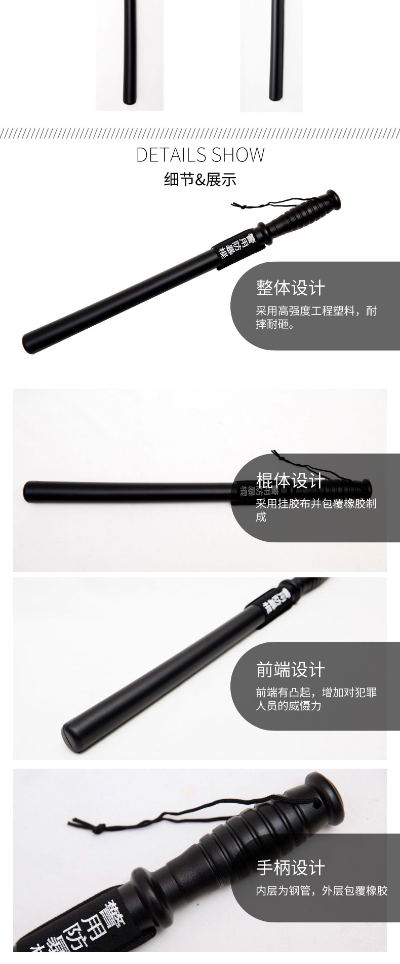 产品介绍:采用高强度工程塑料,耐摔耐砸。棍体采用挂胶布并包覆橡胶制成,前端有凸起,手柄内层为钢管,外层包覆橡胶。握住警棍,感到棍体较软。