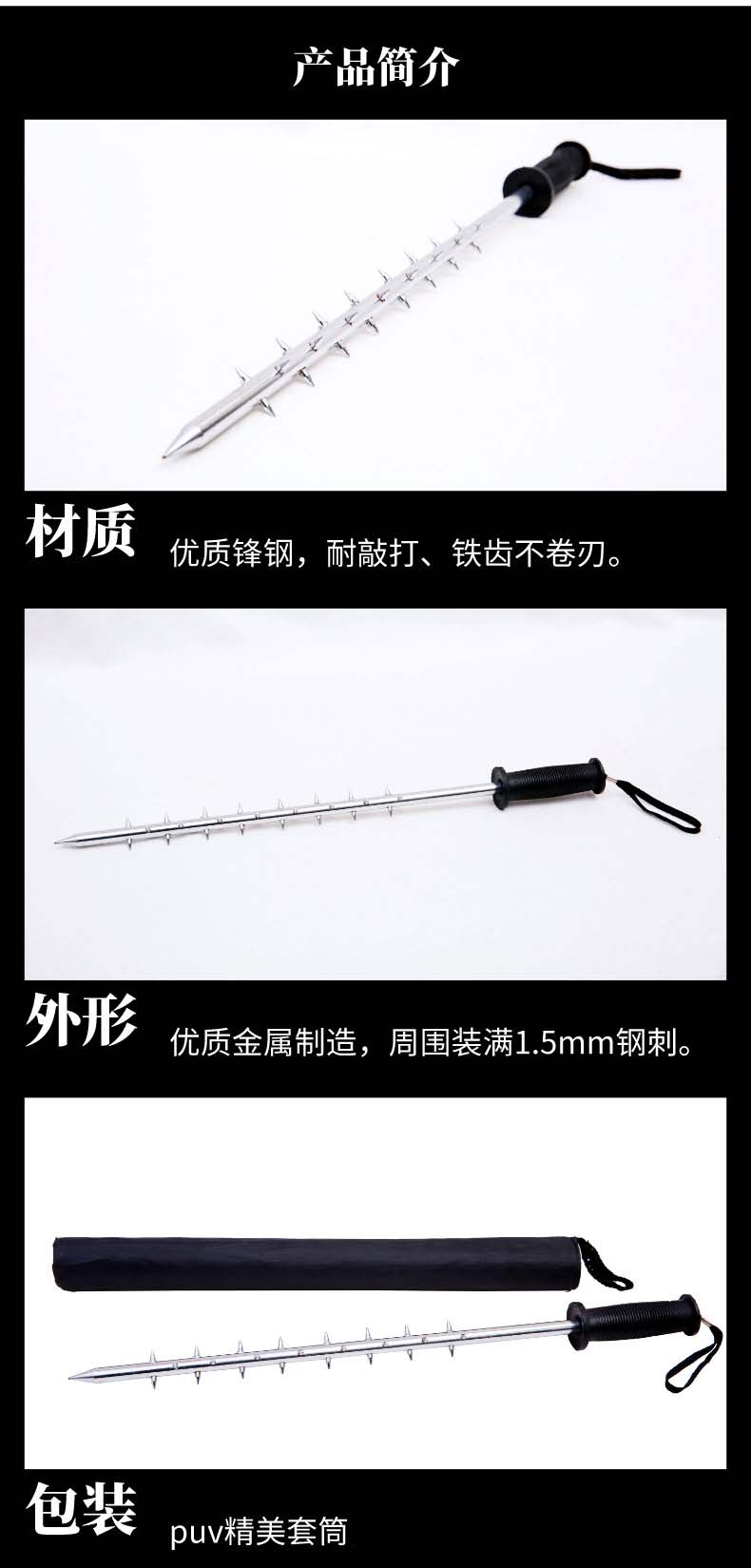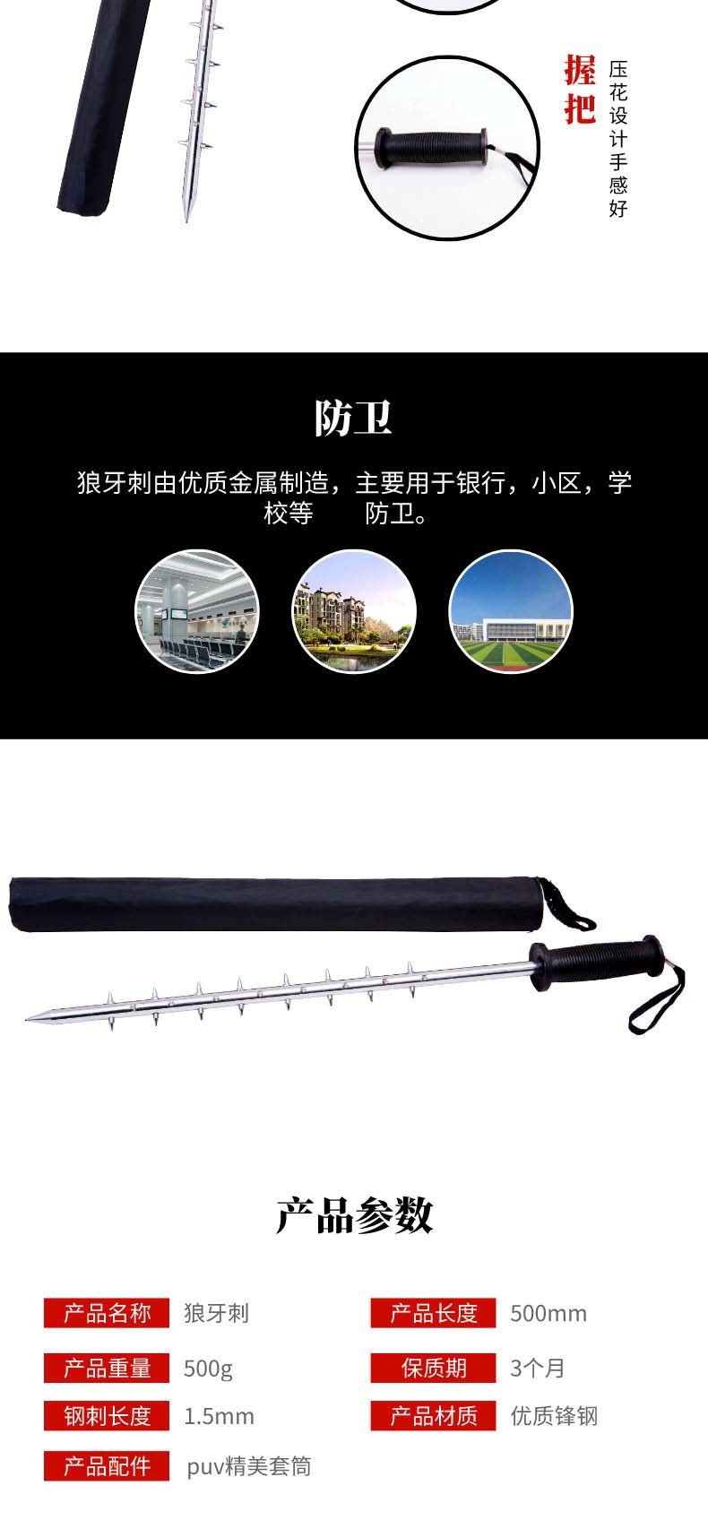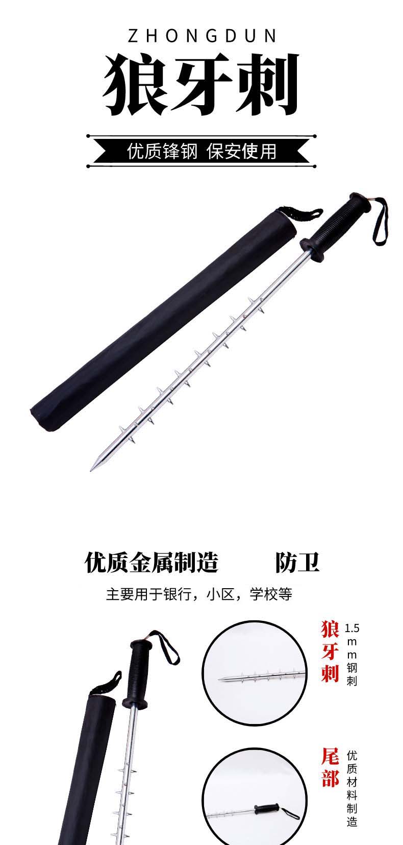 用优质锋钢制成,周围装满1.5mm钢刺,耐敲打、铁齿不卷刃;狼牙棒又称狼牙刺由优质金属制造,主要用于银行,小区,学校等防卫。