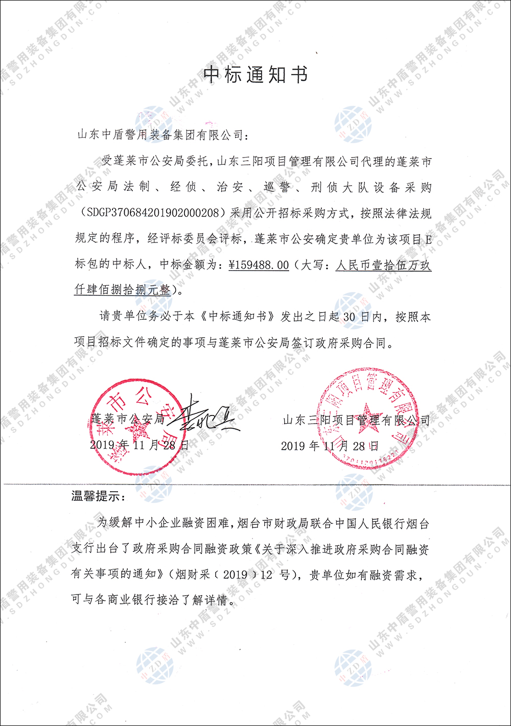 2019年11月28日我公司成功中标《蓬莱市公安局法制、经侦、治安、巡警、刑侦大队设备采购项目》,中标金额159488元。