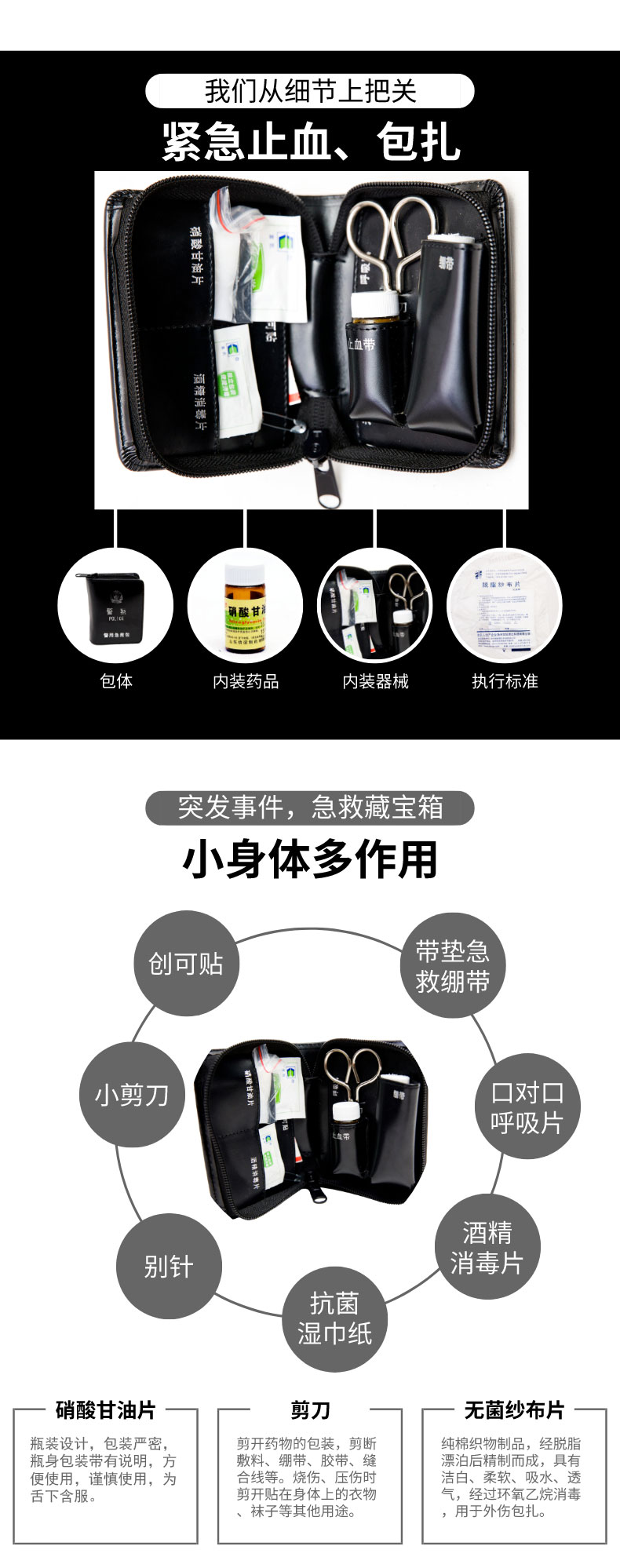 1、硝酸甘油片 2、云南白药创口贴 3、橡胶止血带 4、无菌纱布片 5、带垫救急绷带 6、口对口呼吸膜 7、酒精消毒片 8、抗菌湿纸巾 9、小剪刀 10、别针 |