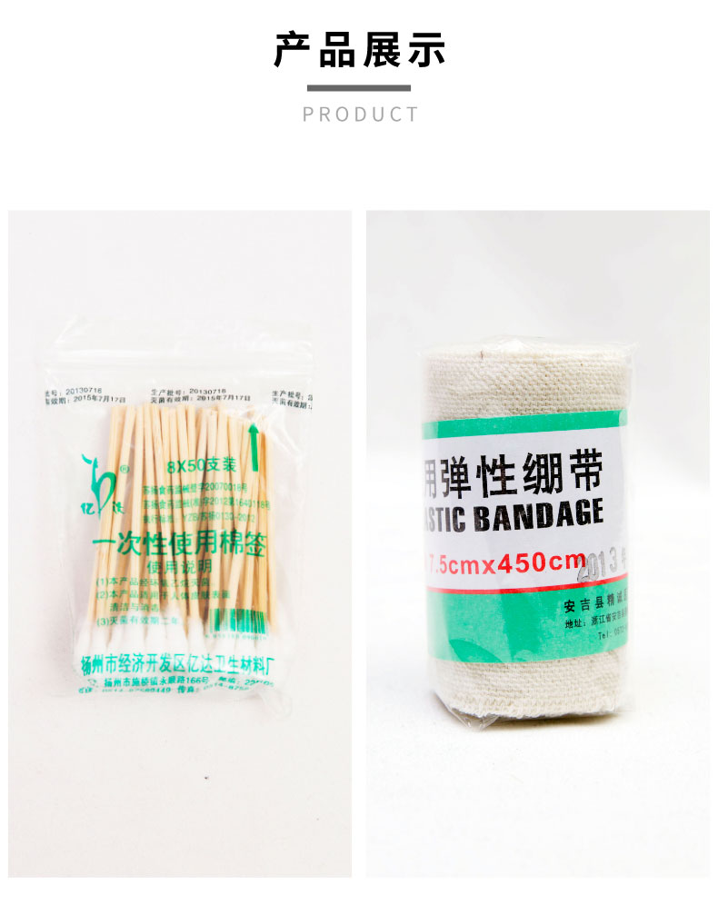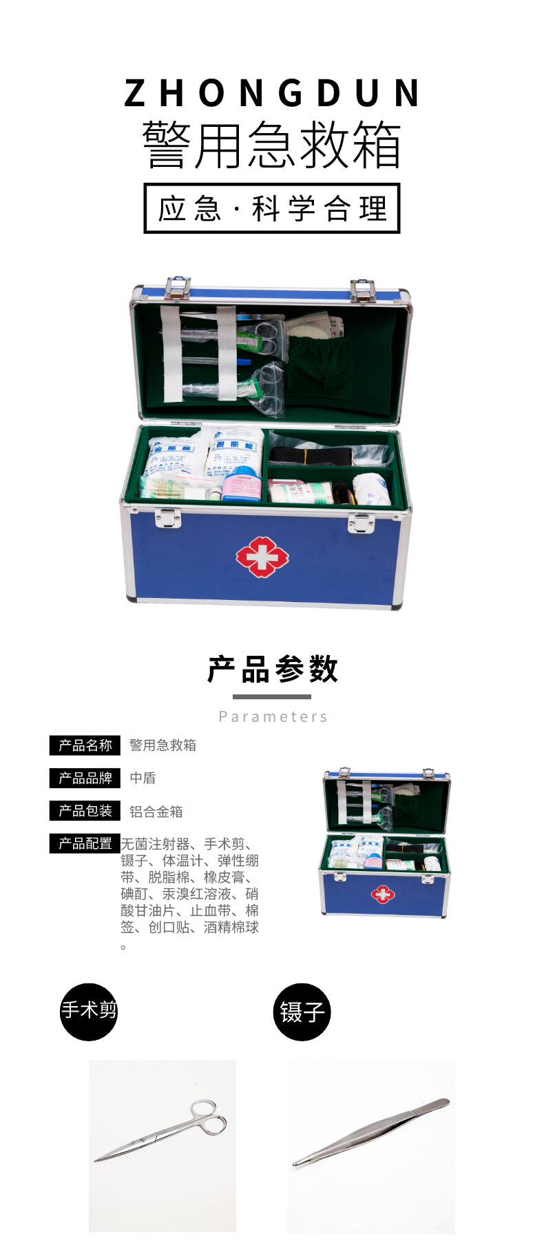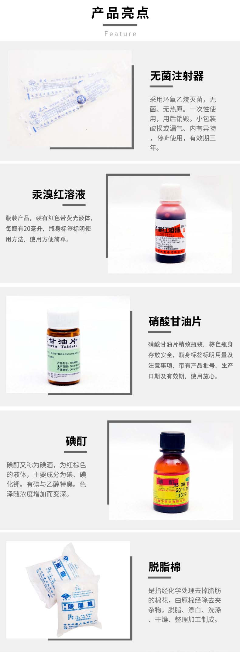 血压表、 双用听诊器、 骨折夹板、 手术剪、 镊子、 脱脂绷带、 灭菌手套、 药棉、 橡皮膏、 碘酊、 红汞、 硝酸甘油片、 止血带、 棉签、 创口贴、 酒精棉球 |
