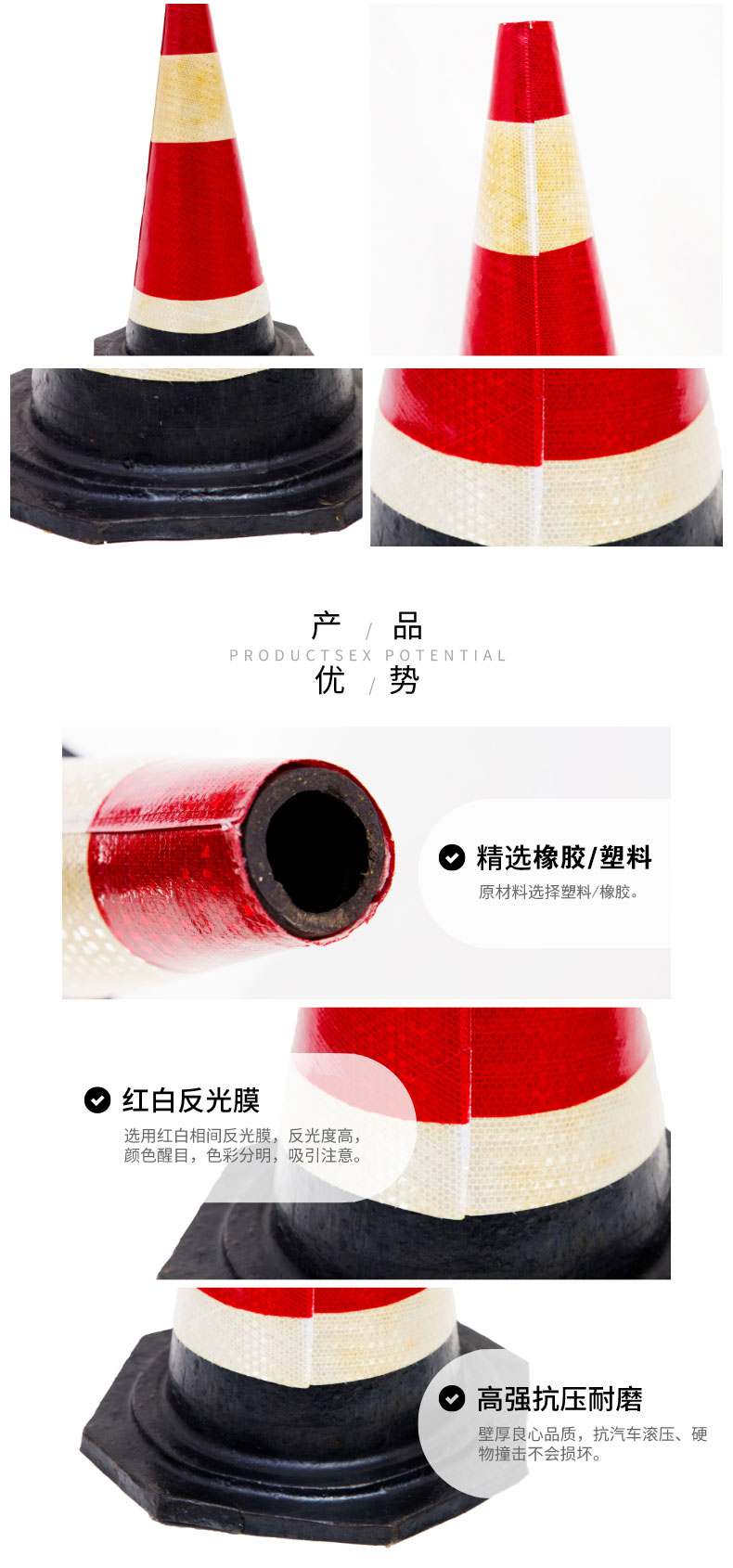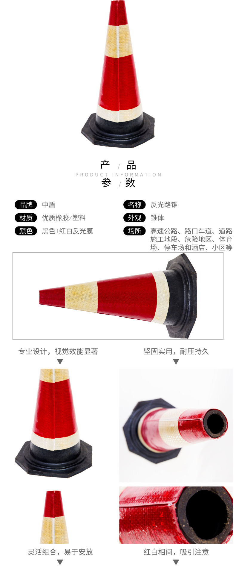 又称交通锥,锥形路标; 材料主要有两种:塑料要比橡胶的耐候性强,环保和柔韧性好。路锥的颜色主要有红,黄,蓝三种,红色主要用在室外交通,城市路口车道,室外停车场,人行道,建筑物之间的隔离警示。黄色主要用在室内的停车场等光线暗淡的地方。