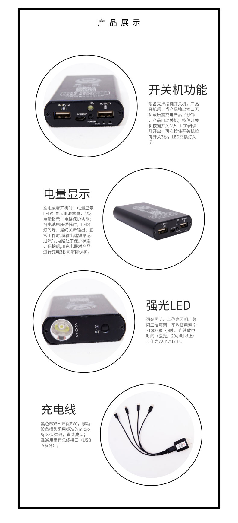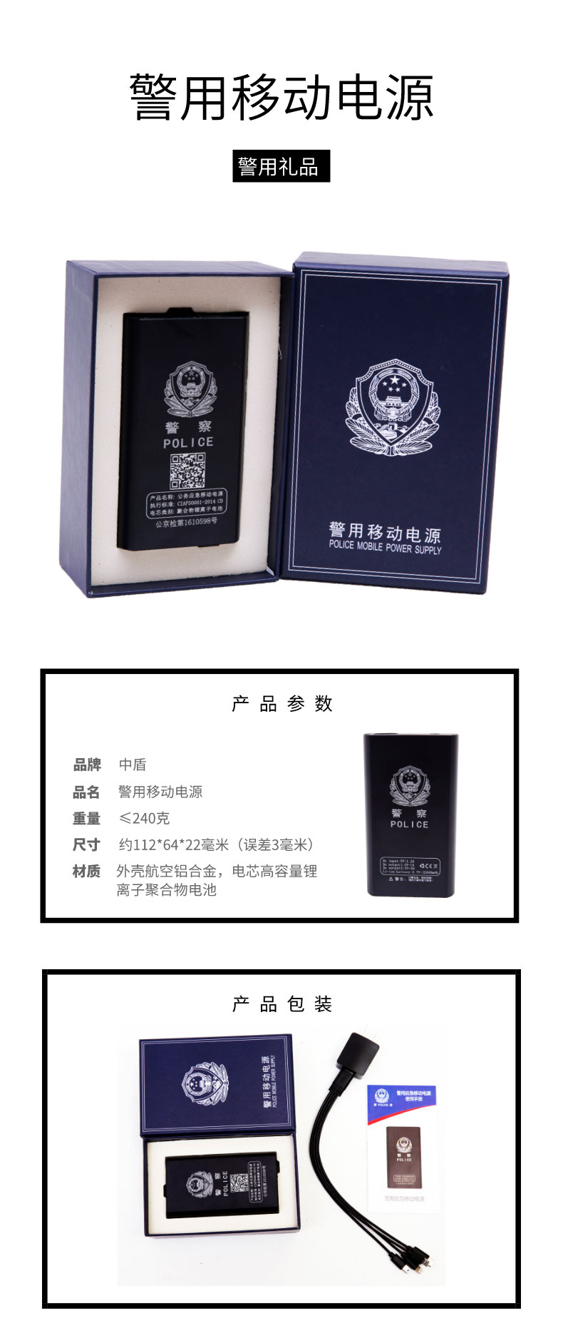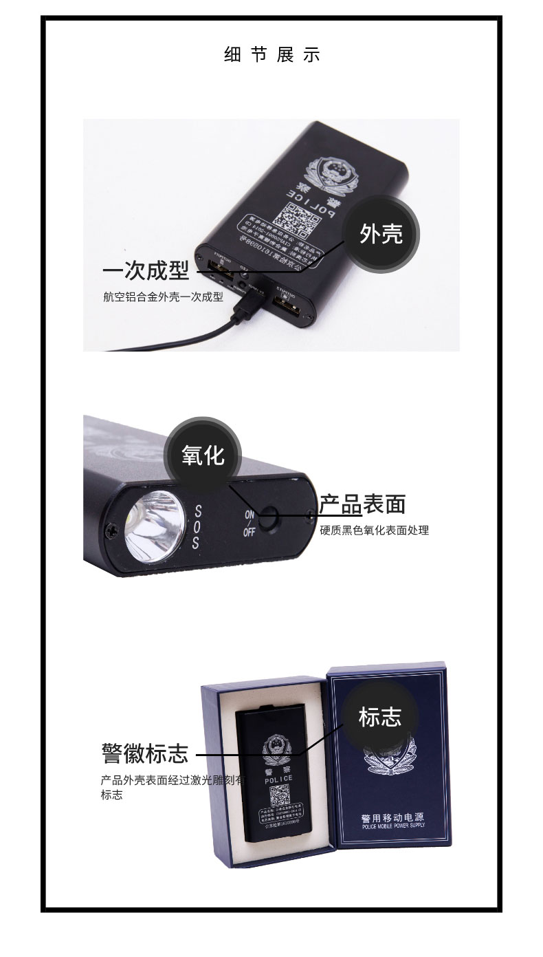 表面为强化铝材 ,点芯容量1.2万毫安, 重量236g, 尺寸 112mm*63mm*21,超大容量随时随地每时每刻都可以给手机充电,出差旅行携带方便;大功率、强光照明,可给记录仪、警务通、平板电脑、手机充电,强光、弱光、爆闪三档照明