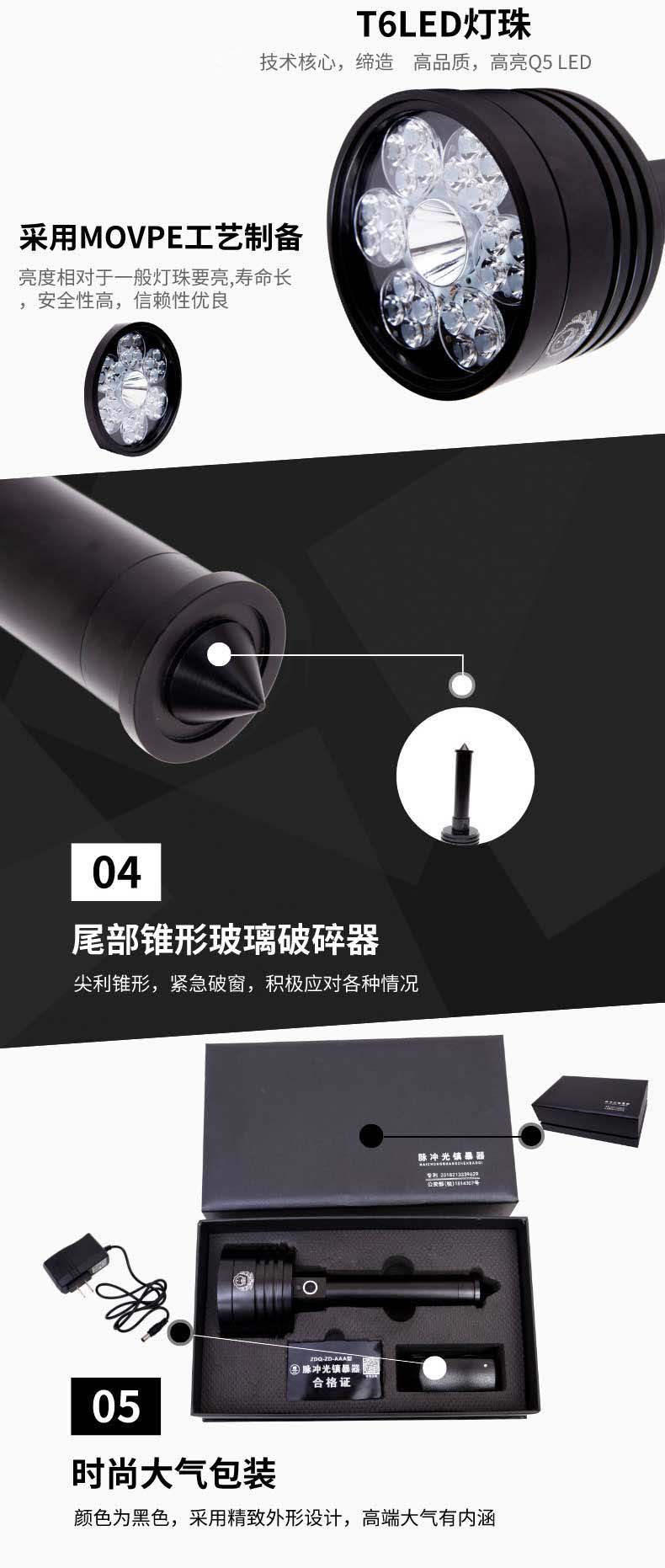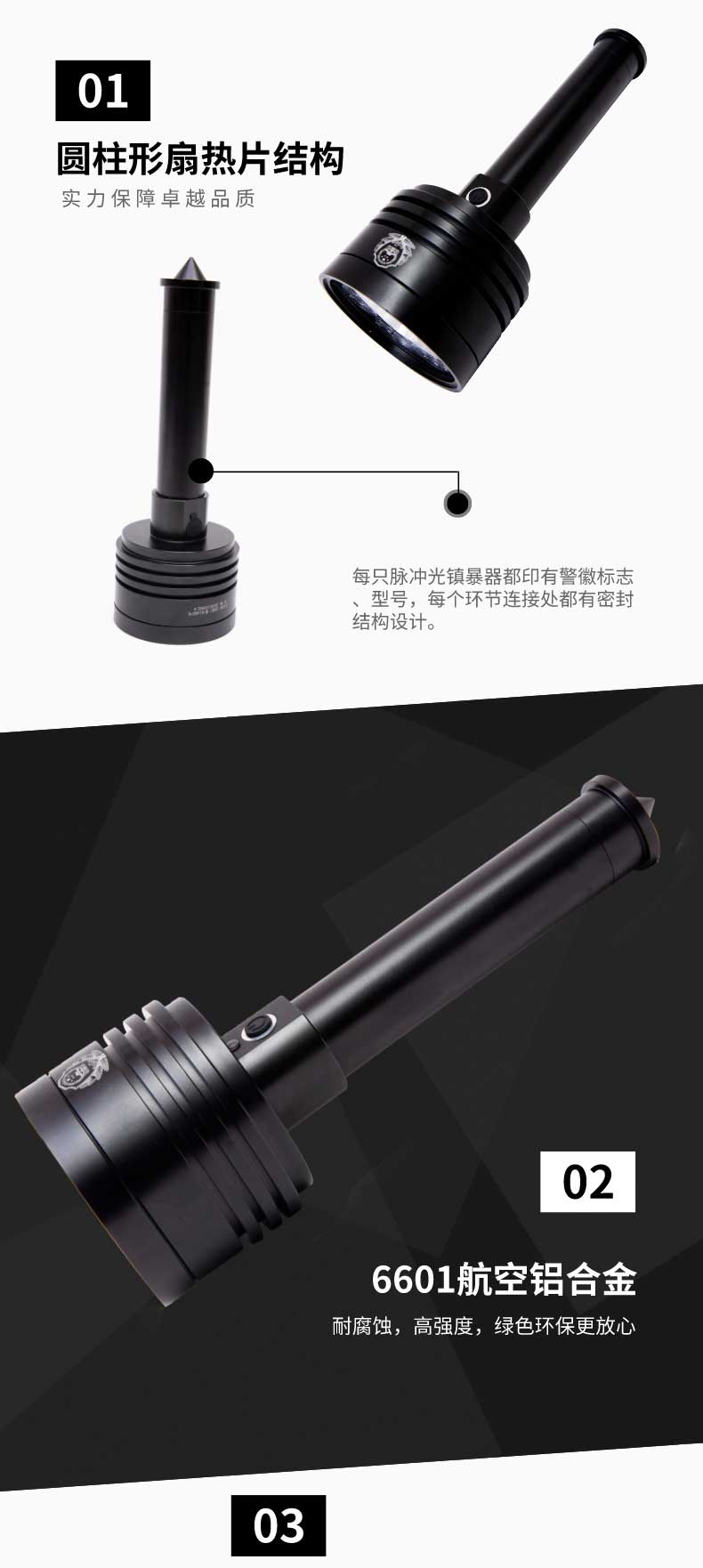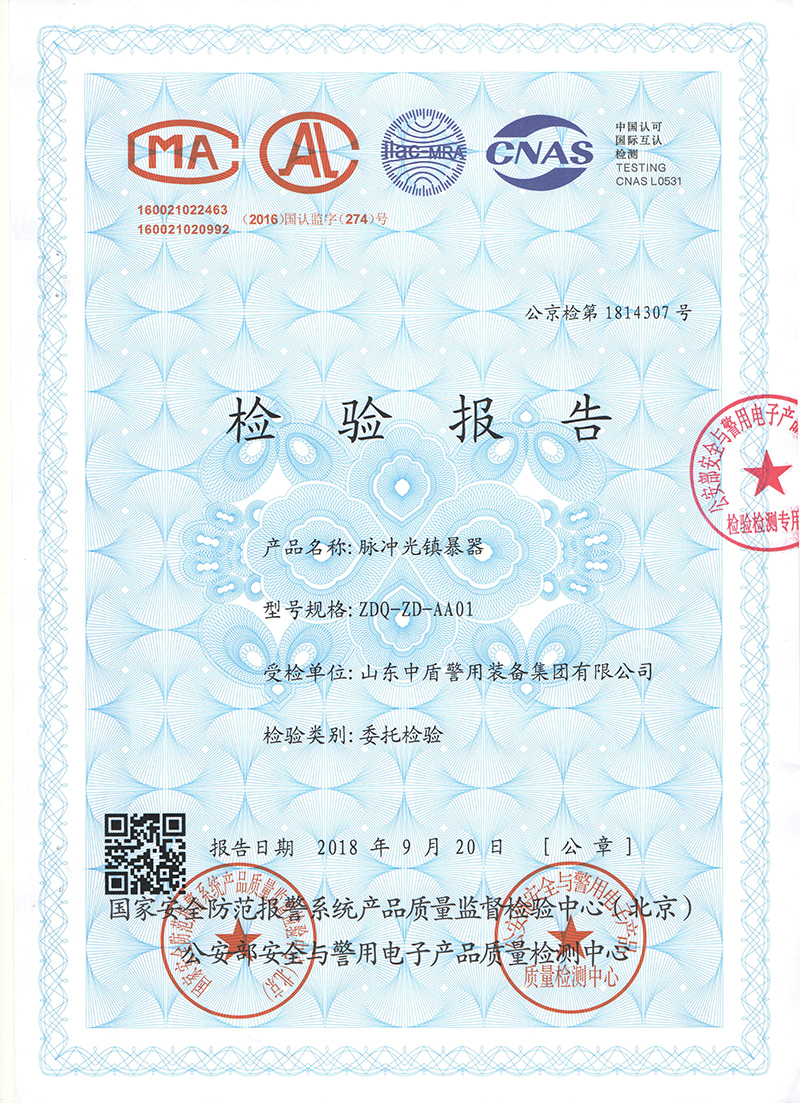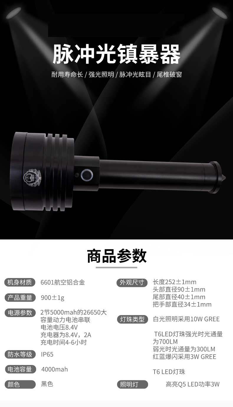 山东中盾警用装备集团出品的脉冲光镇暴器,外形采用圆柱形扇热片结构设计,由头盖、照明单元、手柄等组成。在每个环节连接处都有密封结构设计。本产品为非致命的脉冲光波暴闪频率,当照射歹徒眼睛后会立即引发暂时的视觉障碍(睁不开眼睛与晕眩)而失去攻击力。若持续照射,纵然闭上眼睛亦可能产生头晕与呕吐的现象。