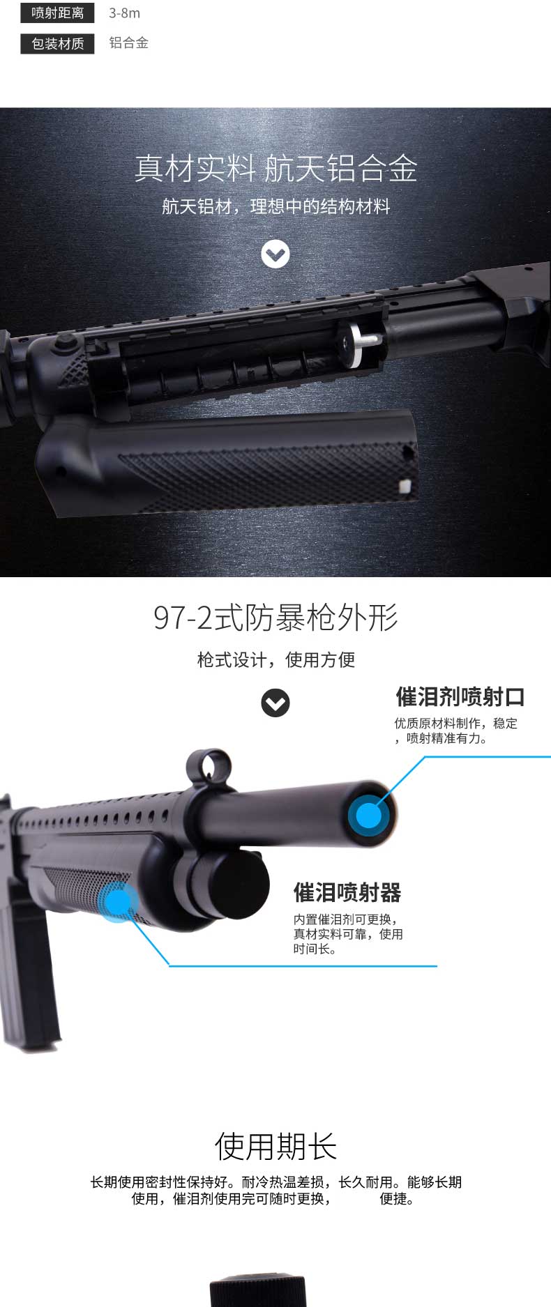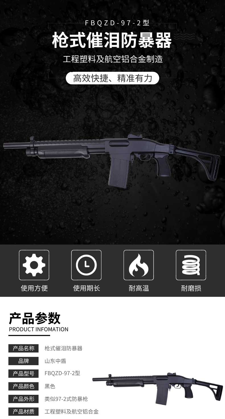 FBQZD-97-2催泪防暴器是山东中盾警用装备集团有限公司新出品的新型催泪防暴器,催泪器由工程塑料及优质航空铝合金制造,主要部件有防暴器壳体、催泪喷射器、推动连杆、扳机、扳机保险、枪托、把手、瞄准器、催泪喷射器快接口、催泪剂导向软管、催泪剂喷射口等部分组成。此催泪防暴器具有催泪剂喷射等功能,广泛用于公安、武警部队、保安武装押运等自卫防暴使用。